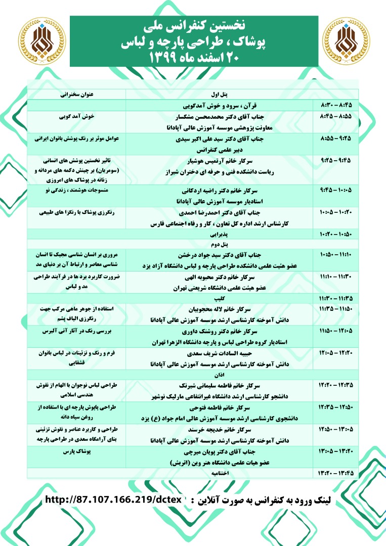 باسلام به اطلاع پژوهشگران گرامی محترم می رساندنخستین کنفرانس ملی پوشاک ، طراحی پارچه و لباس در تاریخ 20 اسفند ماه 1399 راس ساعت 8.30 صبح به صورت مجازی برگزار خواهد شد .لذا پژوهشگران گرامی جهت حضور در کنفرانس به صورت آنلاین می توانند از طریق نرم افزار ادوبی کانکت با لینک زیر وارد شوند. http://87.107.166.219/dctex برای دانلود نرم افزار Adobe Connect نسخه ویندوز میتوانید از لینک زیر استفاده کنید.&n ...